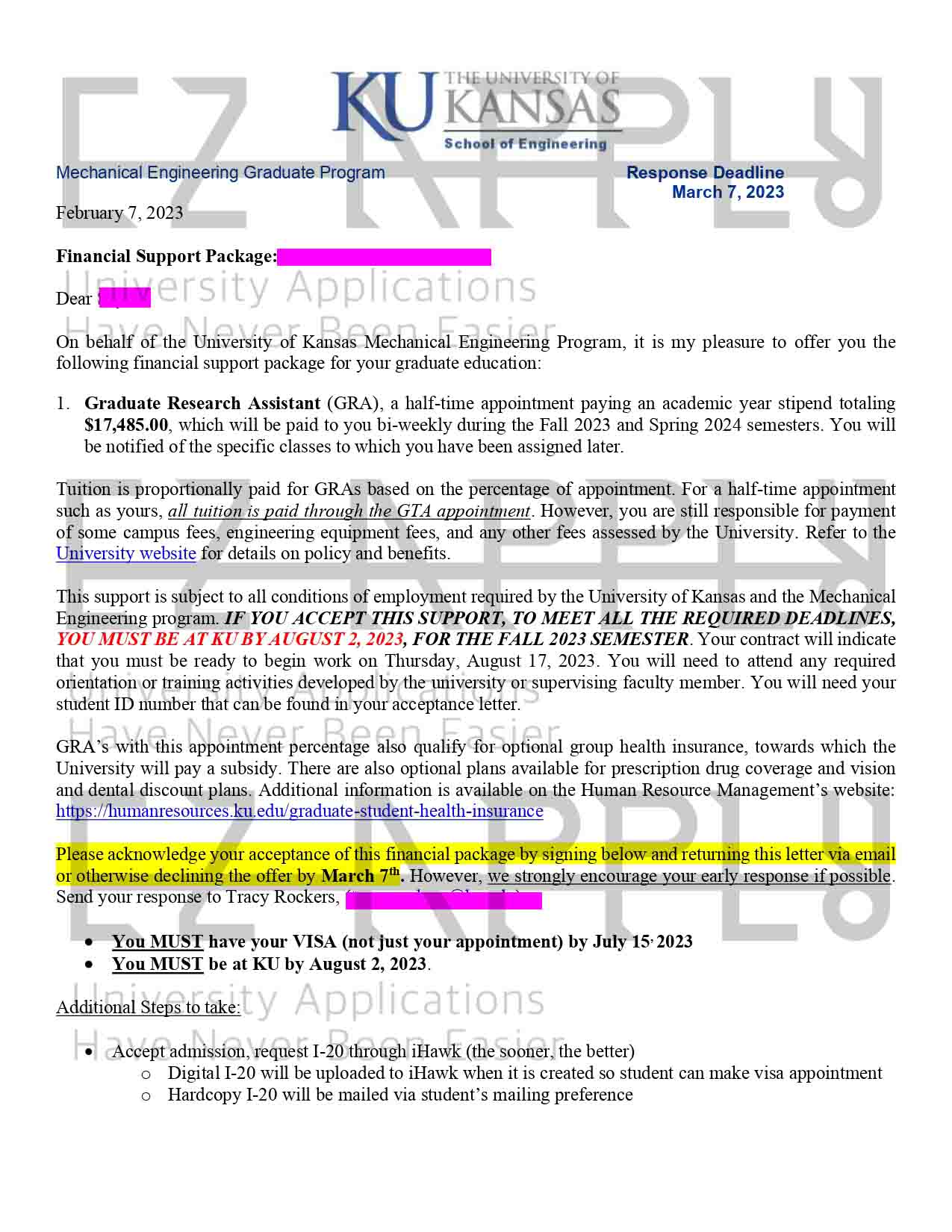 پذیرش فول فاند اخذ شده توسط تیم ایزی اپلای در مقطع «دکتری» در رشتهی «مهندسی مکانیک» از «Universty of Kansas» در آمریکا برای پاییز 2023
