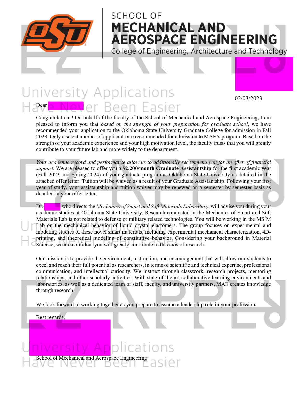 پذیرش فول فاند اخذ شده توسط تیم ایزی اپلای در مقطع «دکتری» در رشته «مهندسی مکانیک و هوافضا» از «Oklahoma State University» درآمریکا برای پاییز 2023