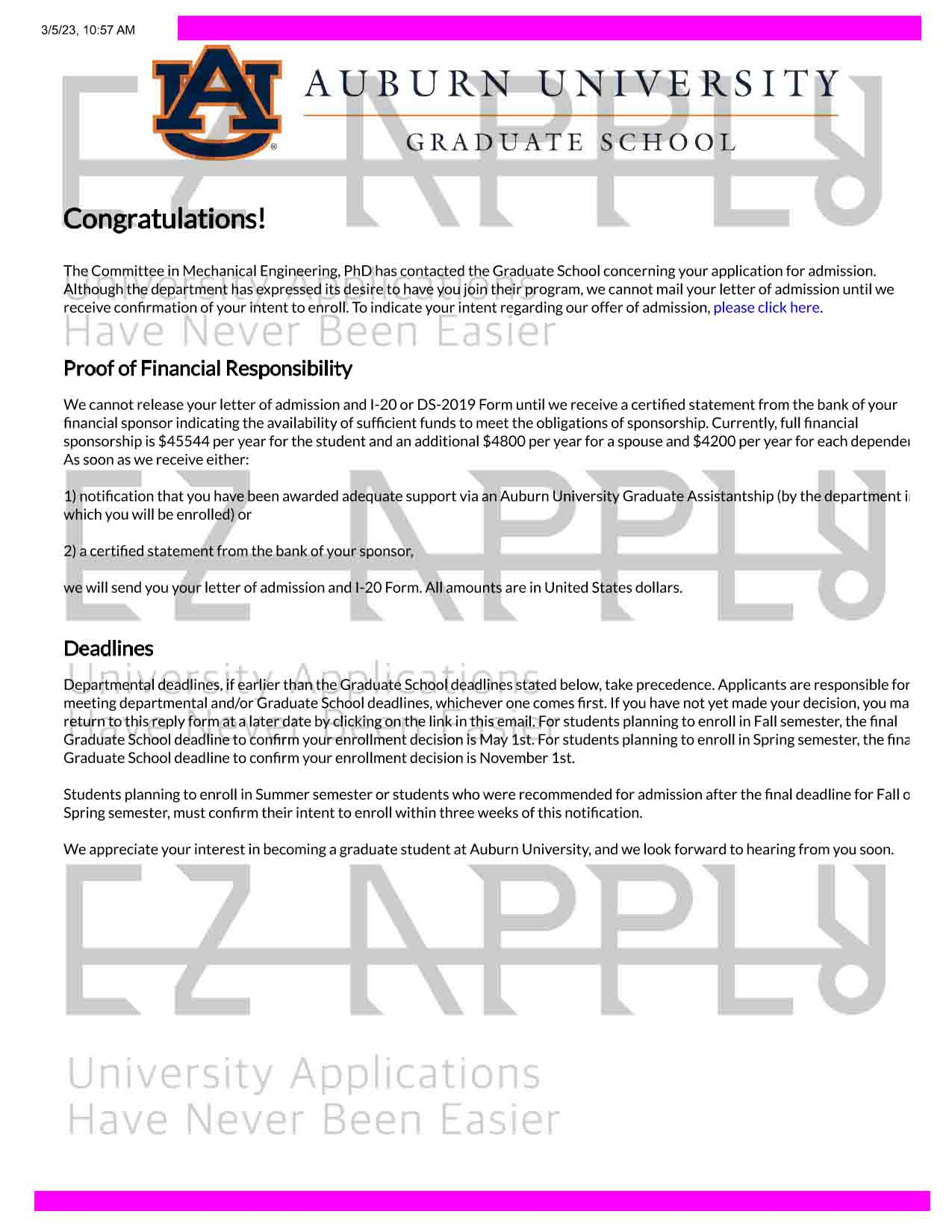 پذیرش فول فاند اخذ شده توسط تیم ایزی اپلای در مقطع «دکتری» در رشته «مهندسی مکانیک» از «Auburn University» درآمریکا برای پاییز 2023
