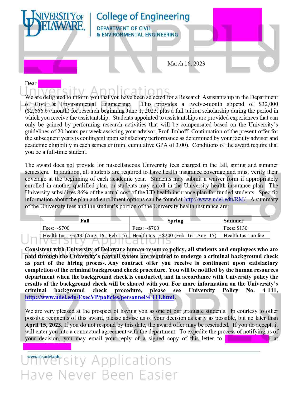 پذیرش فول فاند اخذ شده توسط تیم ایزی اپلای در مقطع «دکتری» در رشته «Civil & Environmental Engineering» از «University of Delaware» در آمریکا برای پاییز 2023
